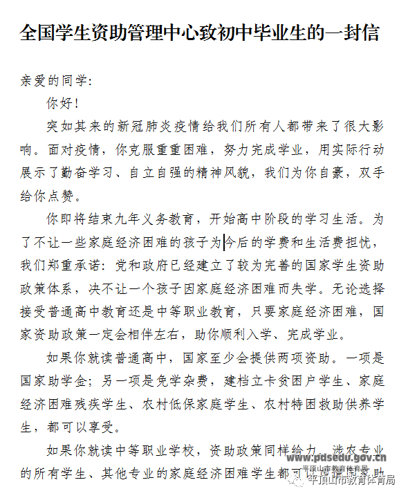 全国学生资助管理中心致初中毕业生的一封信