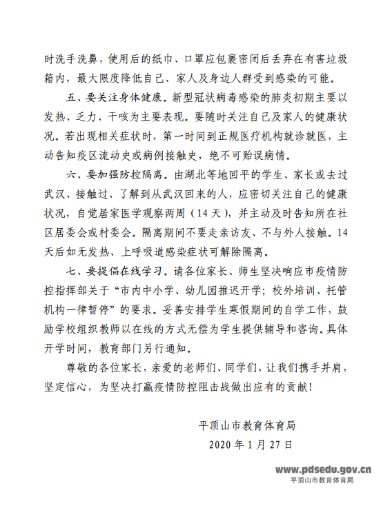 六、要加强防控隔离。由湖北等地回平的学生、家长或去过武汉、接触过、了解到从武汉回来的人,应密切关注自己的健康状况,自觉居家医学观察两周(14天),并主动及时告知所在社区居委会或村委会。隔离期间不要走亲访友、不与外人接触。14天后如无发热、上呼吸道感染症状可解除隔离。