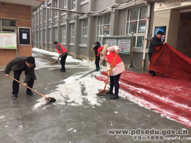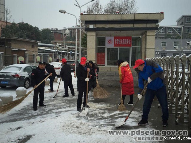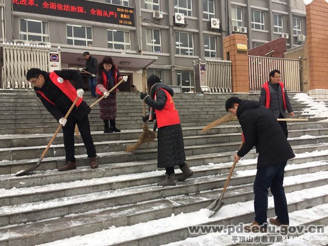 1月9日,我市普降大雪,造成道路结冰难行,给校园道路交通带来安全隐患,给师生出行造成极大的不便。为了及时清除积雪,方便师生出行,确保师生校内安全。上午10点十一中组织教师志愿者20多人清扫道路冰雪,在楼道内铺设防滑地毯,并对学生加强安全教育,排查并积极消除暴雪天气带来的安全隐患,保障师生出行安全。