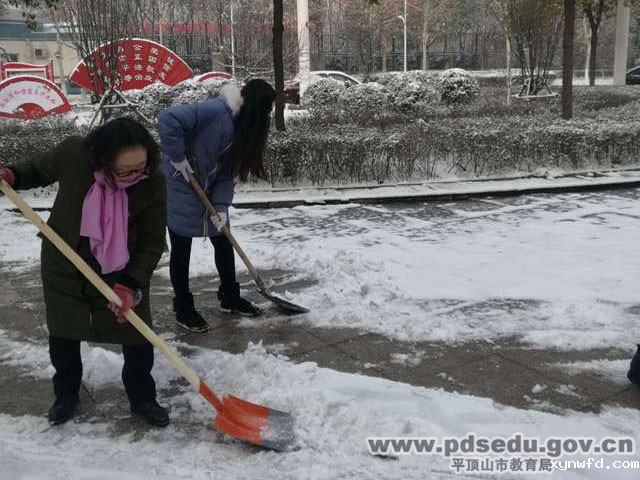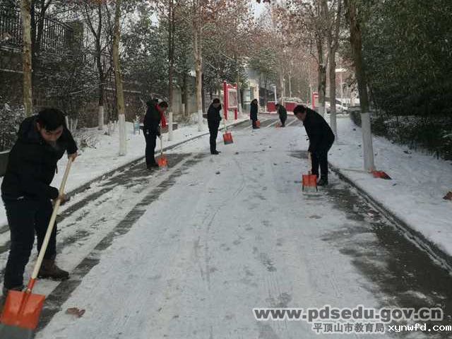 为了减少事故的发生,平顶山一中附属初中党支部,及时组织没课的教职工及党员开展铲雪活动。校长王东辉亲临一线,参与的同志个个干劲冲天,激情飞扬,给冬日的寒冷增添了无限的温暖。经过老师们的努力,学生们放学经过的主要道路上的积雪被铲除,为学生们提供了安全通道。
