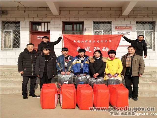 寒风凛冽,冬日严严,帮扶学校孩子的现状时刻牵挂着市三高师生的心,1月16日上午,带着全校师生以及社会爱心人士董全生先生的牵挂与爱心,市三高校长助理解伟,后勤主任薛进联等一行4人驱车前往鲁山帮扶学校:鲁山实验学校、石坡头初级中学进行春风帮扶慰问活动。