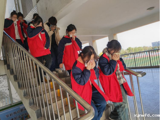 宿舍警报声响起,演练正式开始。宿舍各楼层各楼梯负责安全疏导的老师各司其职,指挥学生按照安全逃生疏散路线有序撤离。同学们闻警而动,秩序井然,低姿弯腰捂住口鼻,迅速向安全场地撤离。