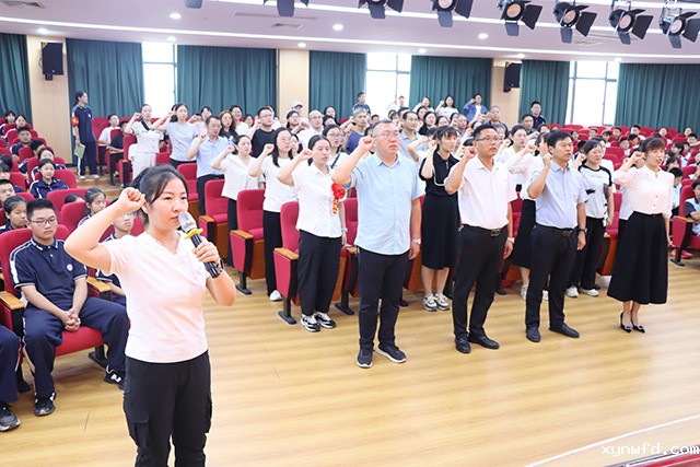 在热烈的氛围中,全体教职工起身肃立,右手握拳举至胸前,庄严宣誓。铿锵有力的誓言回荡在会场,不仅是对教育事业的郑重承诺,更是全体教师坚守初心、勇担使命的决心与宣言。
