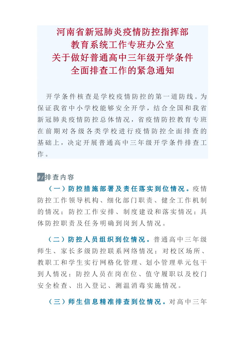 关于做好普通高中三年级开学条件全面排查工作的紧急通知