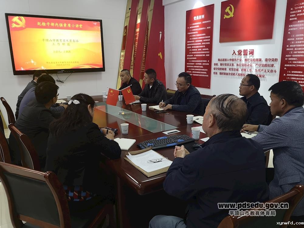 2020年10月9日上午,驻市教体局纪检监察组举行第四期纪检干部内强素质小讲堂,纪检组全组同志、教体局机关党委、机关纪委相关同志及市教育技术装备站班子成员到场参加学习。