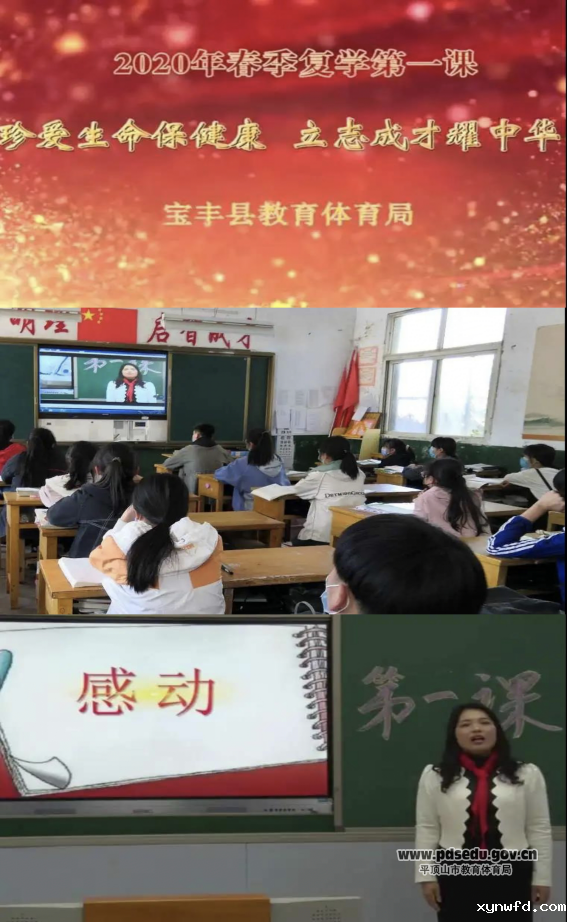 落实立德树人根本任务——创新做好“自选动作”。按照市局文件精神,为深化“把灾难当教材,与祖国共成长”主题教育活动,宝丰县教体局充分发挥思政工作骨干教师作用,集中力量、精心制作《复学第一课》——“珍爱生命保健康 立志成才耀中华”,并于复学当天组织初三学生收看。本节课在“感动”、“情怀”、“知识”、“生命”、“未来”五个关键词的引领下,配以直观生动的视频、图片,声情并茂地讲述抗疫故事,结合疫情防控教育学生努力学习文化知识。从激发感情到理性升华,从抗击疫情到学习生活,浓浓的爱国之情贯穿始终,由浅入深、环环相扣,立足眼前、展望明天,引导学生树立生命意识、坚定理想信念、涵养家国情怀、砥砺奋斗精神,努力成长为担当民族复兴大任的时代新人。