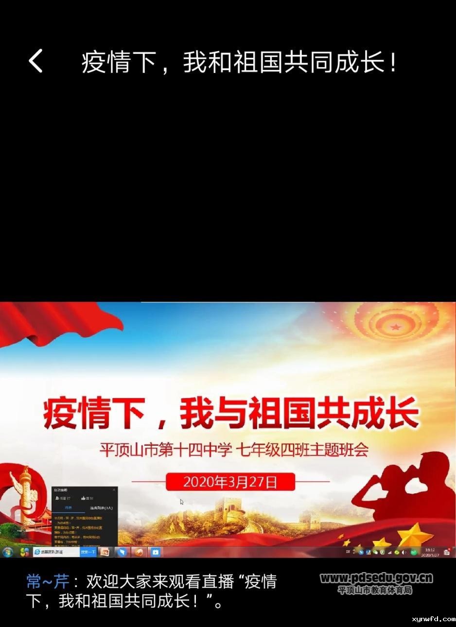 为落实“把灾难当成教材,与祖国共成长”的工作要求,大力加强学生爱国主义教育与理想信念教育,把疫情危机化为教育契机,3月27日,市十四中组织全体班主任通过钉钉网络直播形式,召开《疫情下,我与祖国共成长》线上主题班会。