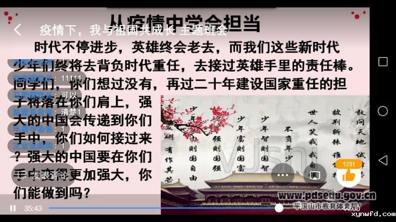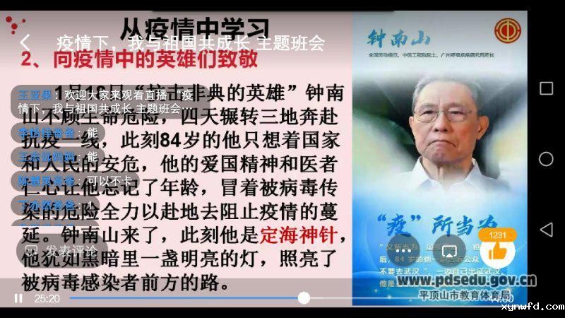 结合各班学情和班级实际,每位班主任老师广泛收集资料,剪辑视频,精心制作课件,通过直播的方式,语音连麦、群内讨论等互动形式,为同学们一一呈现抗疫英雄的感人故事,着重引导学生们在疫情下对家国情怀的思考。
