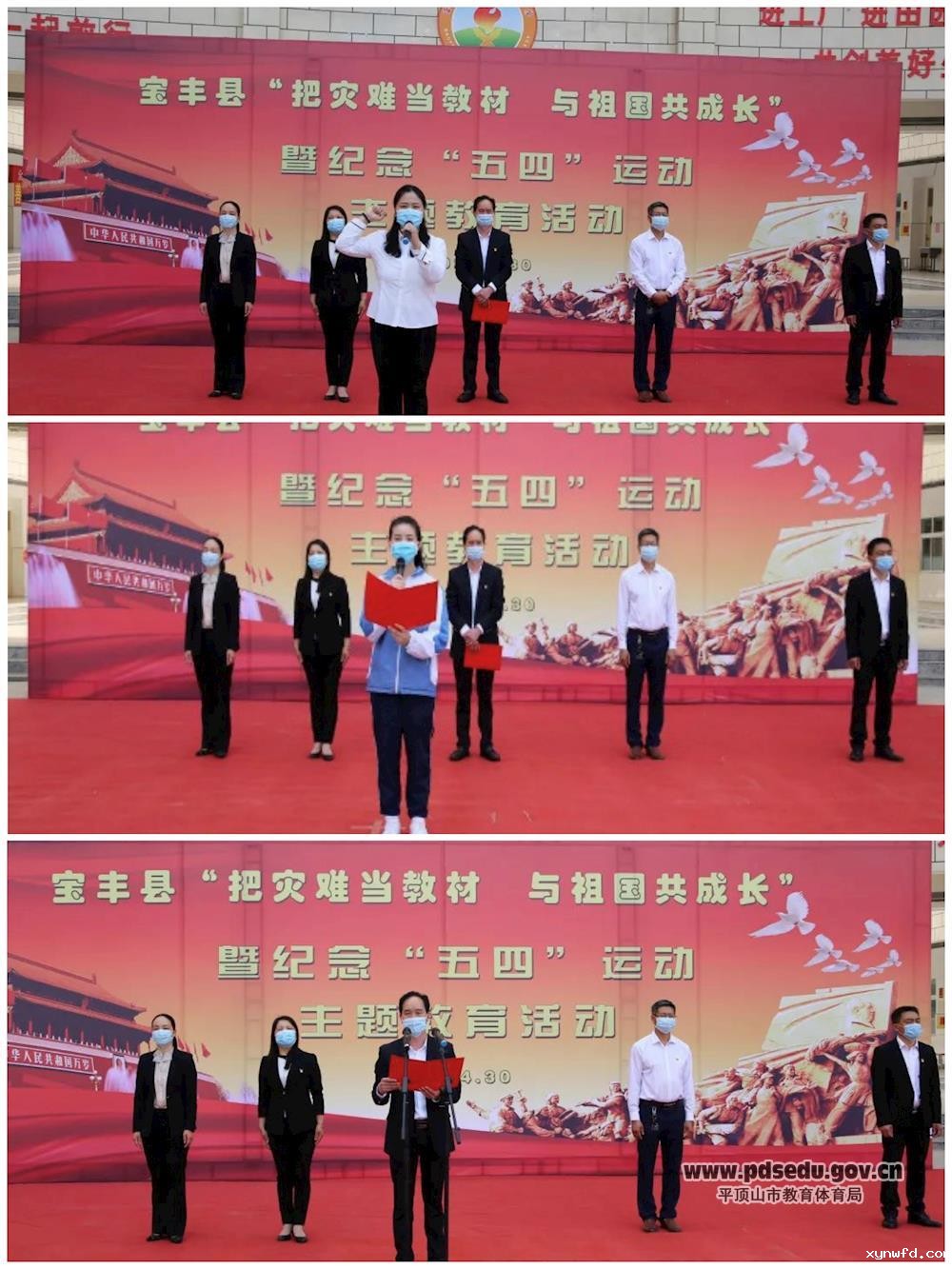 4月30日上午,宝丰县教体局在源丰初中举行“把灾难当教材 与祖国共成长”暨纪念“五四”运动主题教育活动。宝丰县教体局相关负责同志、股室负责人及源丰初中九年级全体师生参加活动。
