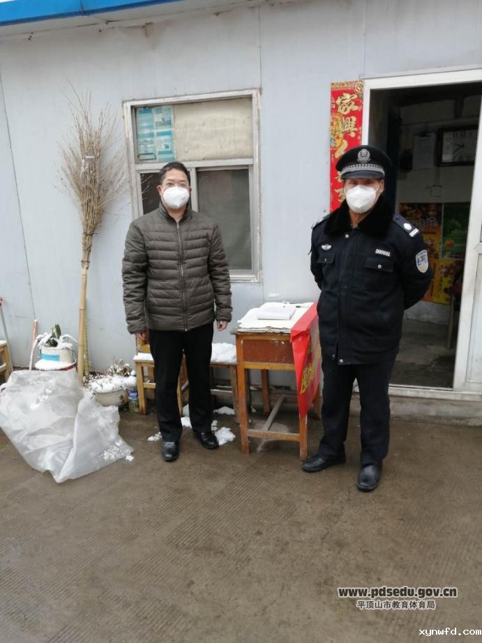 市一中临时党支部宣传委员程会锋在家属院门口与门卫一起值班